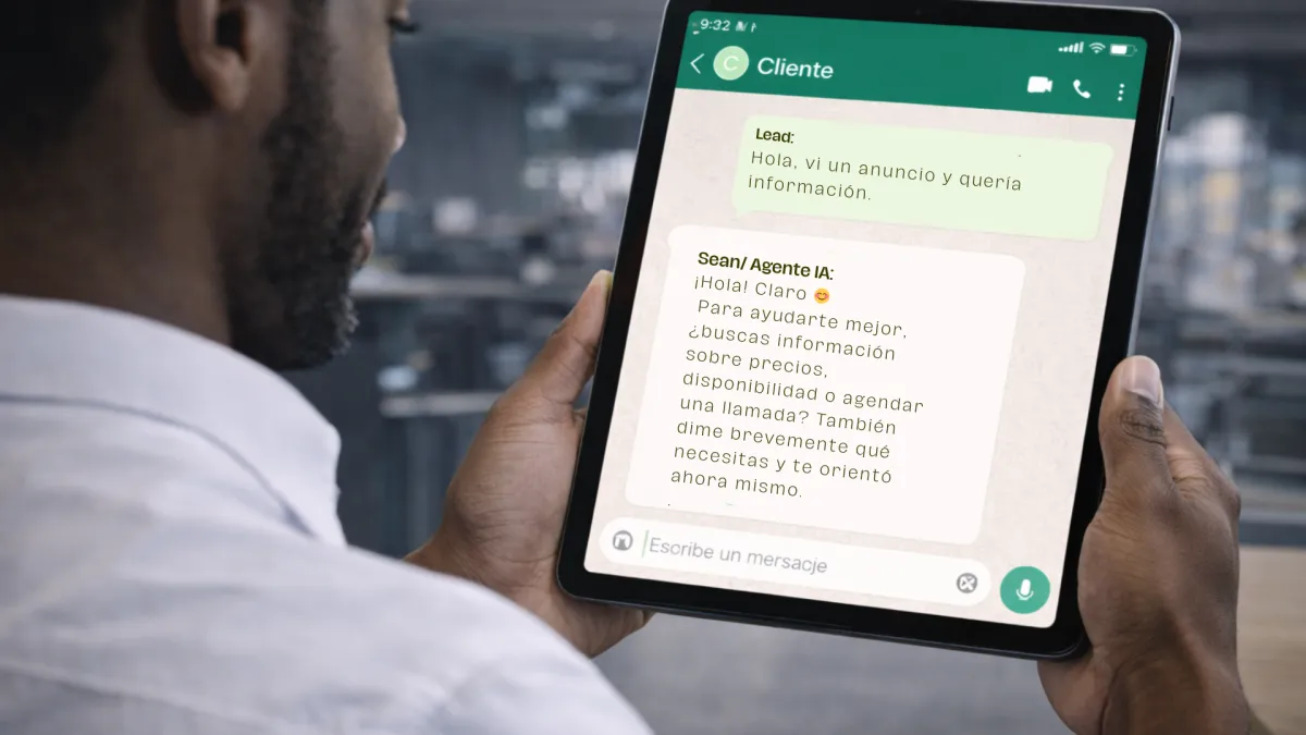 Un Agente de IA está entrenado con el conocimiento real de tu empresa (servicios, procesos, criterios de venta, FAQs) y es capaz de responder mensajes, cualificar leads, tomar decisiones simples y ejecutar acciones, como agendar citas o hacer seguimiento.